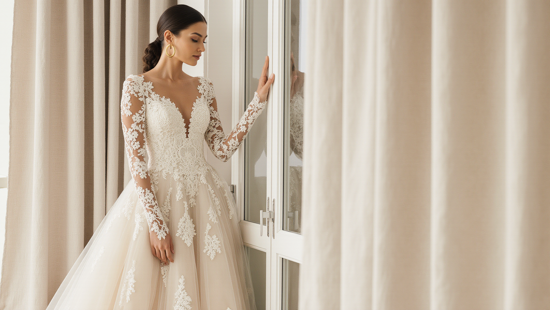 We use only the finest materials — silk, satin, lace, and tulle — sourced from prestigious textile houses for a naturally elegant drape.