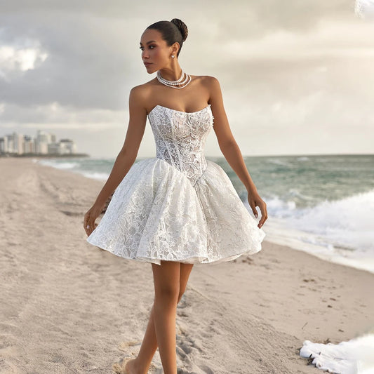 Affordable Short Bridal Dress - Shiny Tulle Skirt with Lace Applique, Ruffled Hem - Perfect for Casual Weddings