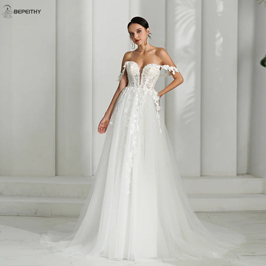 BEPEITHY Customized V Neck A Line Wedding Dresses For Women 2024 Spring Lace Off Shoulder Bride Bridal Gown Vestidos De Novias