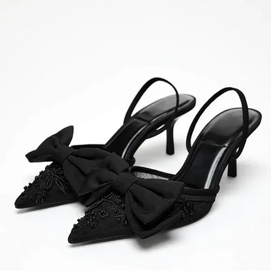Black Mesh Beaded Decoration Heeled Sandals Women Sexy Pointed Toe Slingbacks Thin High Heels Elegant Bow Designer Women Pumps