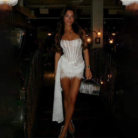 Elegant Two Wide Straps Squre neck Short Lace Dresses With Detachable Satin Tail 2 in 1 Bridal Grown
