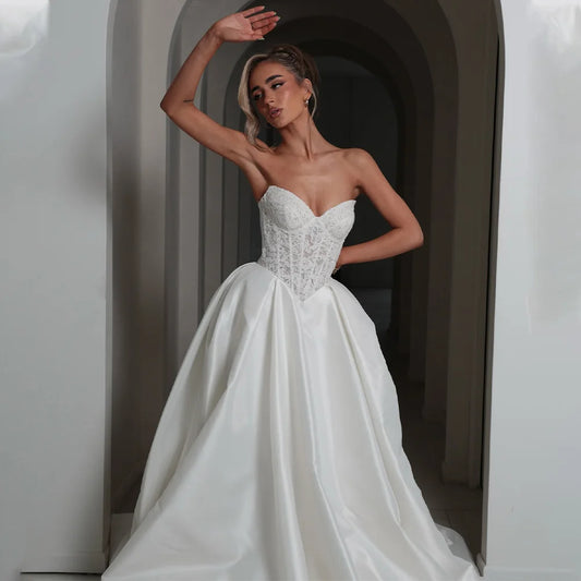 Pearl Corset Wedding Dress – Elegant Strapless Satin Bridal Gown with Draped Bodice & Train | Maison Bridal