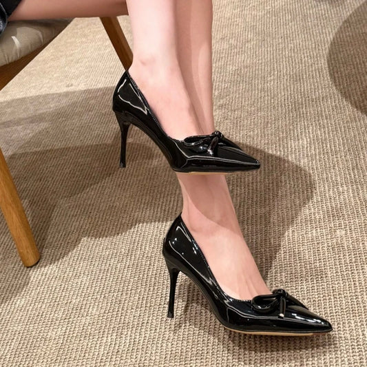 Autumn Hot Fashion bow Patent Leather Royal Sister Temperament Elegant high Heels thin Heels sexy Versatile single shoes Women