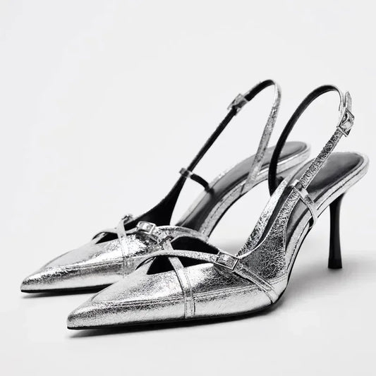 Luxury Silver Mules High Heels Women Sexy Pointed Toe Slingbacks Thin High Heels Sandals Elegant Metal Buckle Design Women Pumps