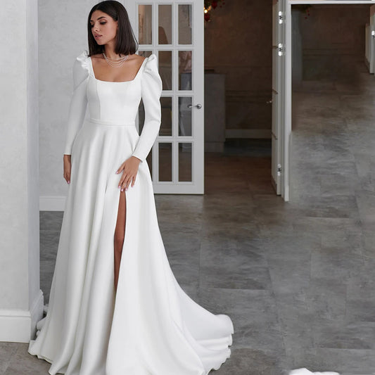 A-Line Wedding Dress Long Sleeve Square Collar Side Slit Simple Satin Open Back Beach Robe De Mariee Custom Made To Measures