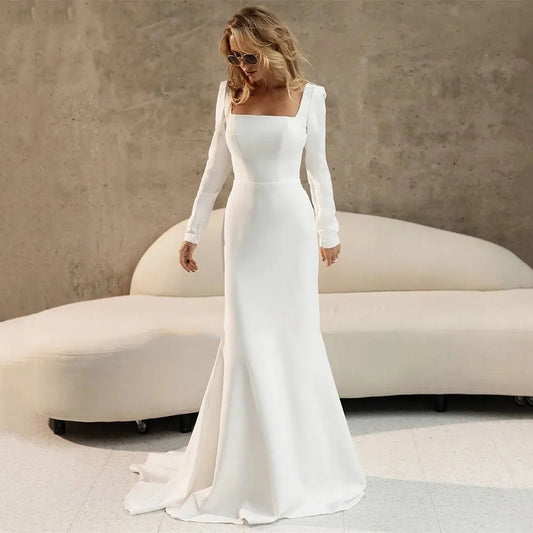 Customized Simple Long Sleeve Mermaid Jersey Wedding Dress Women Elegant and Chic Square Neck Court Train Pure White Bridal Gown