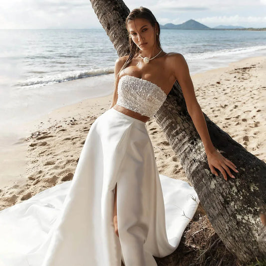 Shiny Beaded Sequined Two Piece Wedding Dresses Side Slit Custom Made 2026 Vestido De Noival