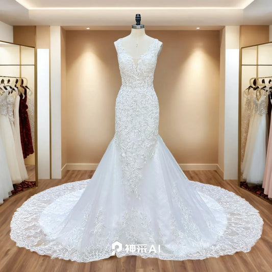 Flavinke Customized V Neck Mermaid Lace Wedding Dresses 2025 Sleeveless Illusion Beaded Satin Bridal Gowns with Detachable Train