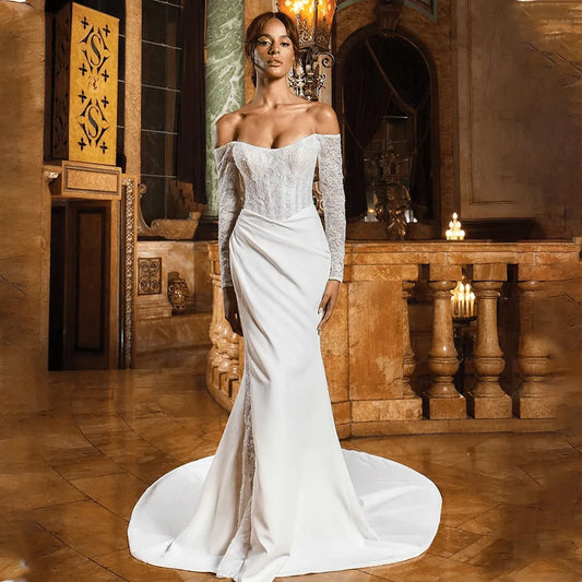 ZHUISHU Elegant Lace Long Sleeves Satin Mermiad Wedding Dress Off The Shoulder Sweep Train Graceful Vestidos De Novia Customized