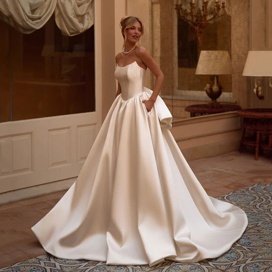 2025 Customized Strapless Satin Wedding Dress Embroidered Lace A-line Princess Ball Dress Sleeveless Bridal Dress Robe