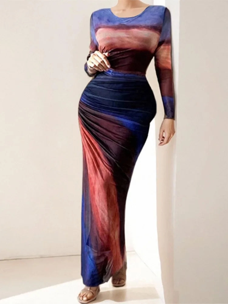 Autumn Temperament Sexy Slim Waisted Long-sleeved Dress Women's Elegant Commuting Round-neck Mid-waist Pleated Hip Skirt
