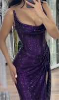 Cathy Customized Purple Strapless Side High Split Prom Dresses Glitter Sheath vestidos de noiva Draped Sleeveless Formal Evening