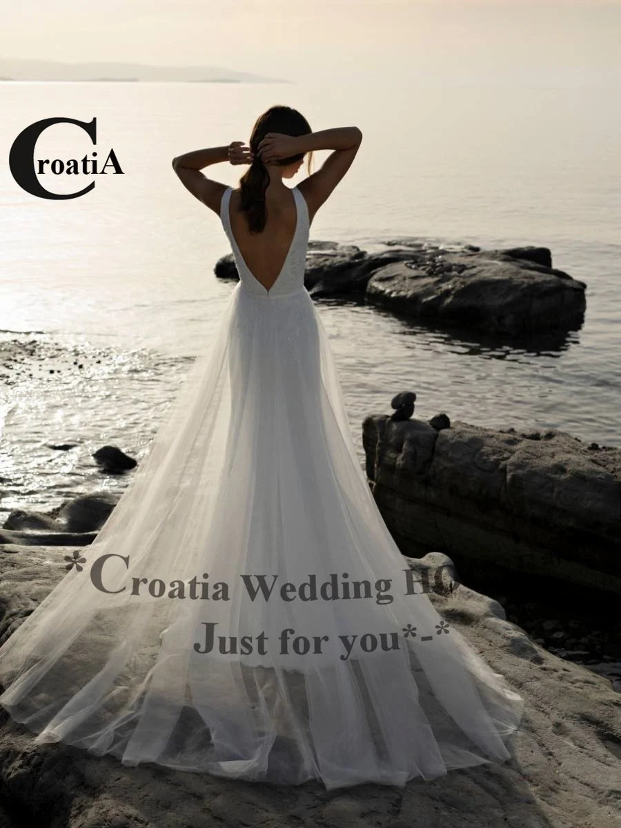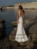 Croatia Fancy Backless Wedding Dresses for Bride Mermaid Satin Appliques Deep V Neck Detachable Train Robe De Mariee Customized