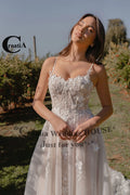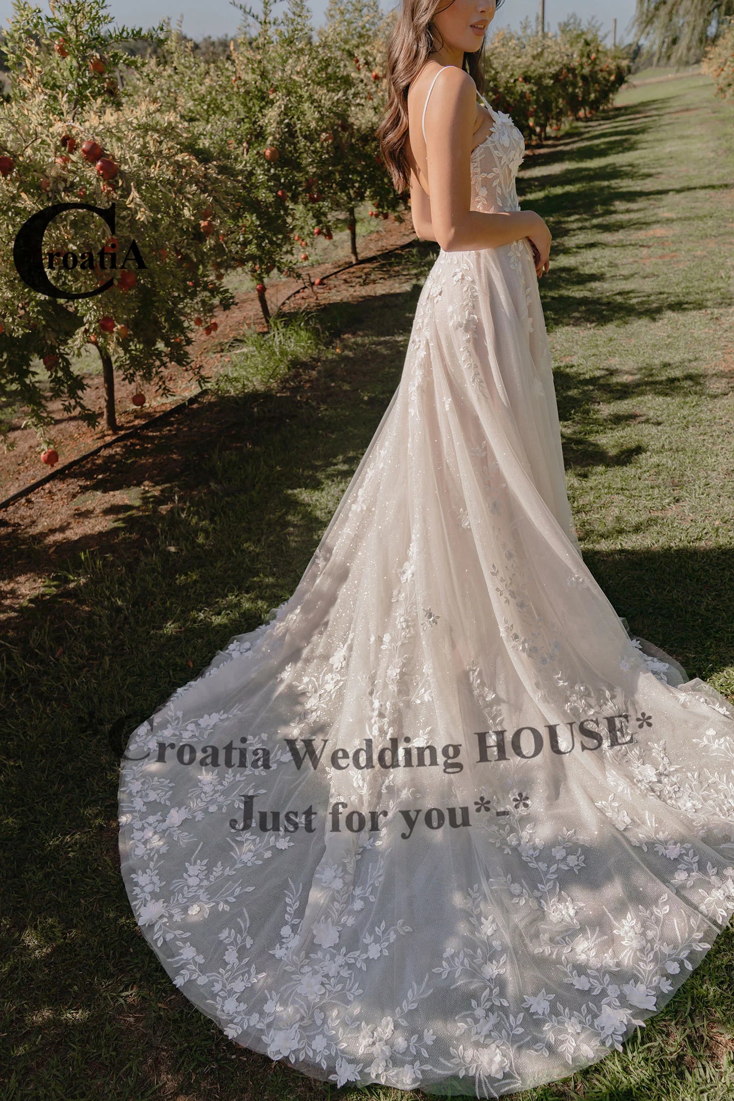Croatia Fashionable Spaghetti Straps Wedding Gowns for Women A Line Appliques Tulle A Line Button Court Train Customized