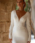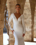 Long Sleeve Deep V-Neck Satin Wedding Dress – Elegant Fitted Mermaid Bridal Gown | Maison Bridal