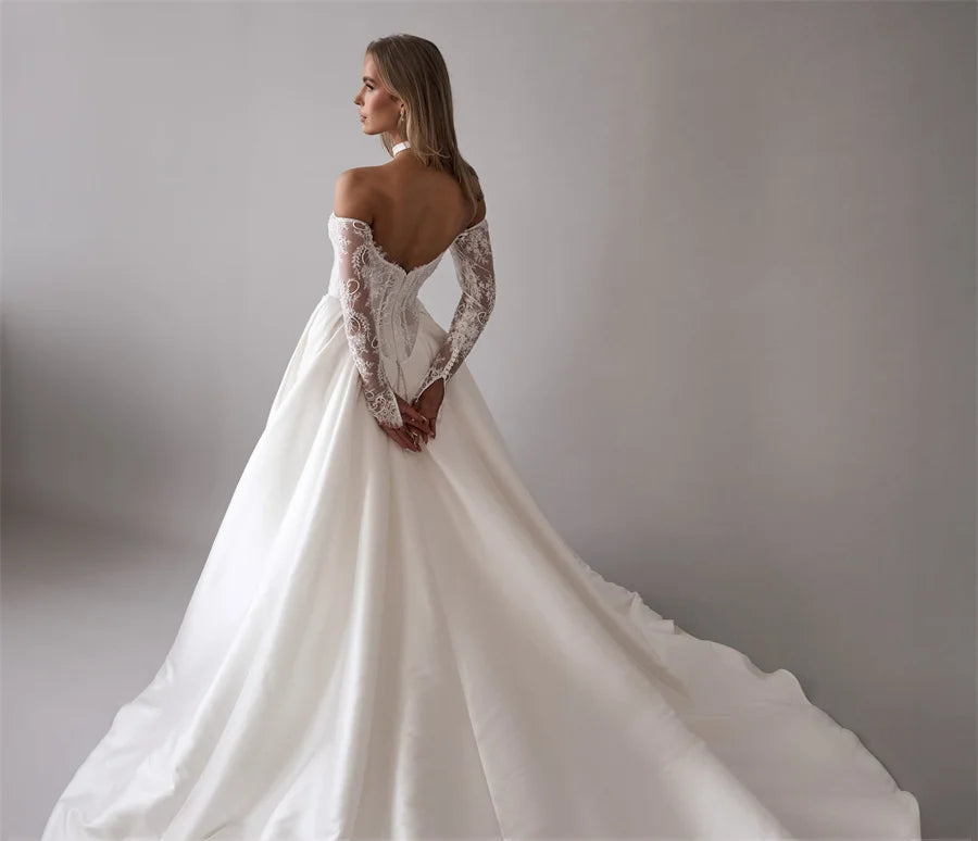 This luxury ball gown features a romantic off-shoulder lace bodice with a sculpted corset waist, creating an exquisite hourglass silhouette. The delicate floral lace sleeves and the sweetheart neckline combine to evoke classic bridal romance, while the structured satin skirt adds majestic volume and contemporary sophistication.
