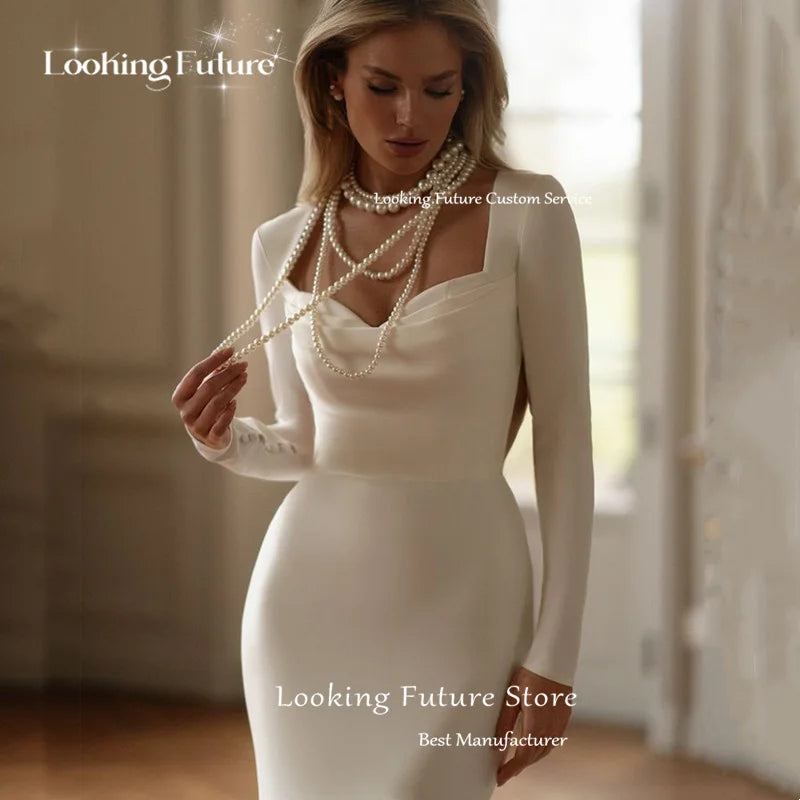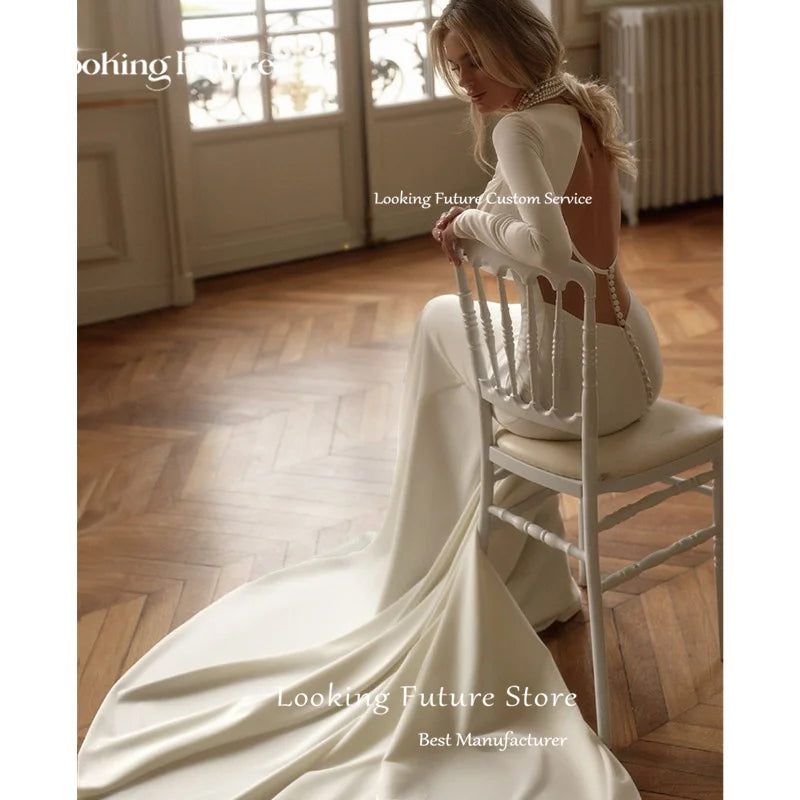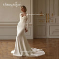 Customized Modern Sexy Mermaid Ivory Satin Wedding Dress Simple Illusion Open Back Button Pleated Long Sleeve Strapless Bridals