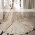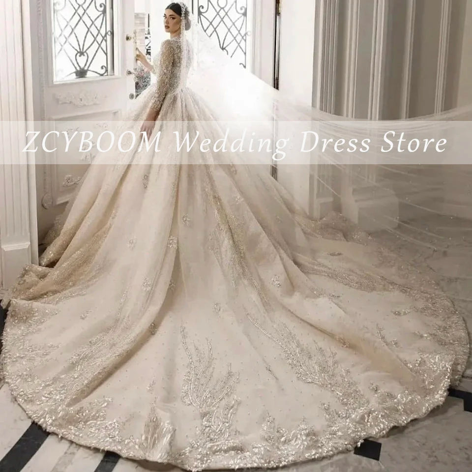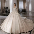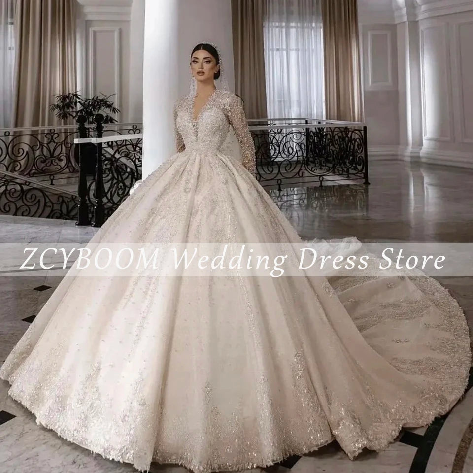Customized V-Neck Sequin Appliques Long Sleeves White Wedding Dress 2025 Ball Gown Floor Length Sweep Train Lace Up Bridal Gown