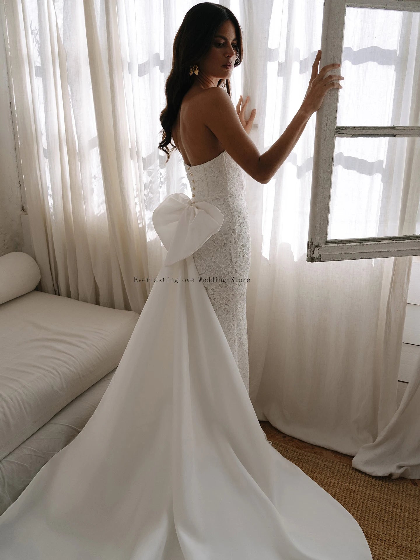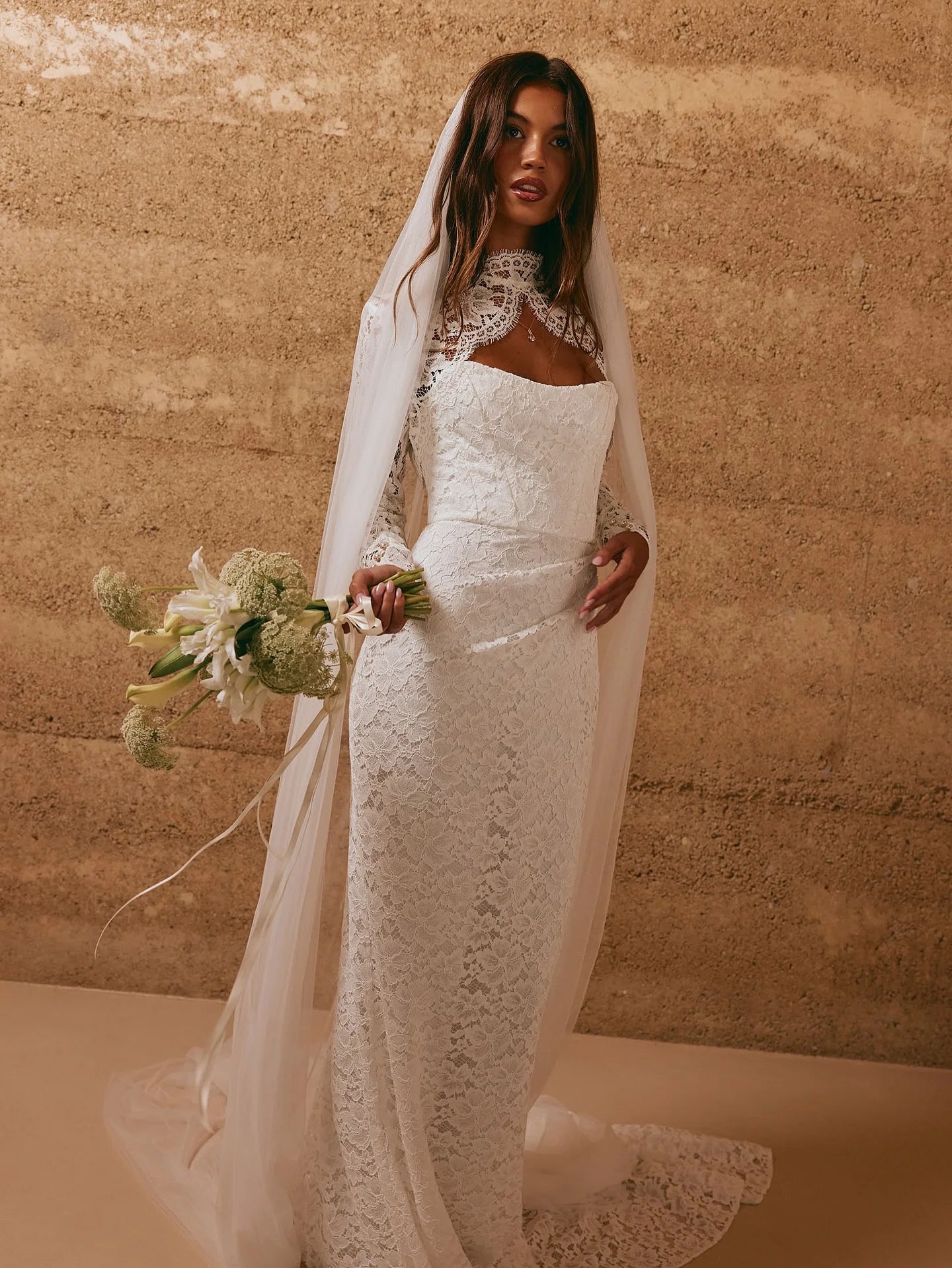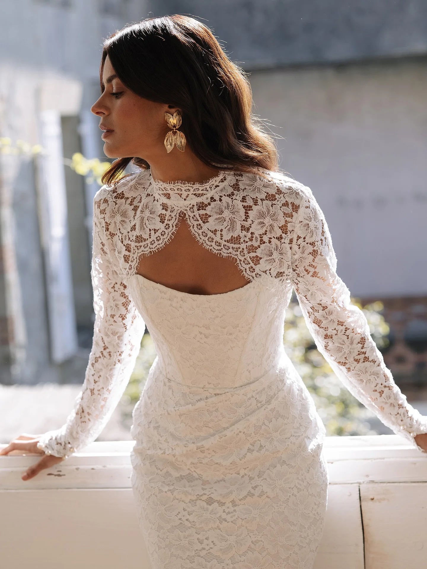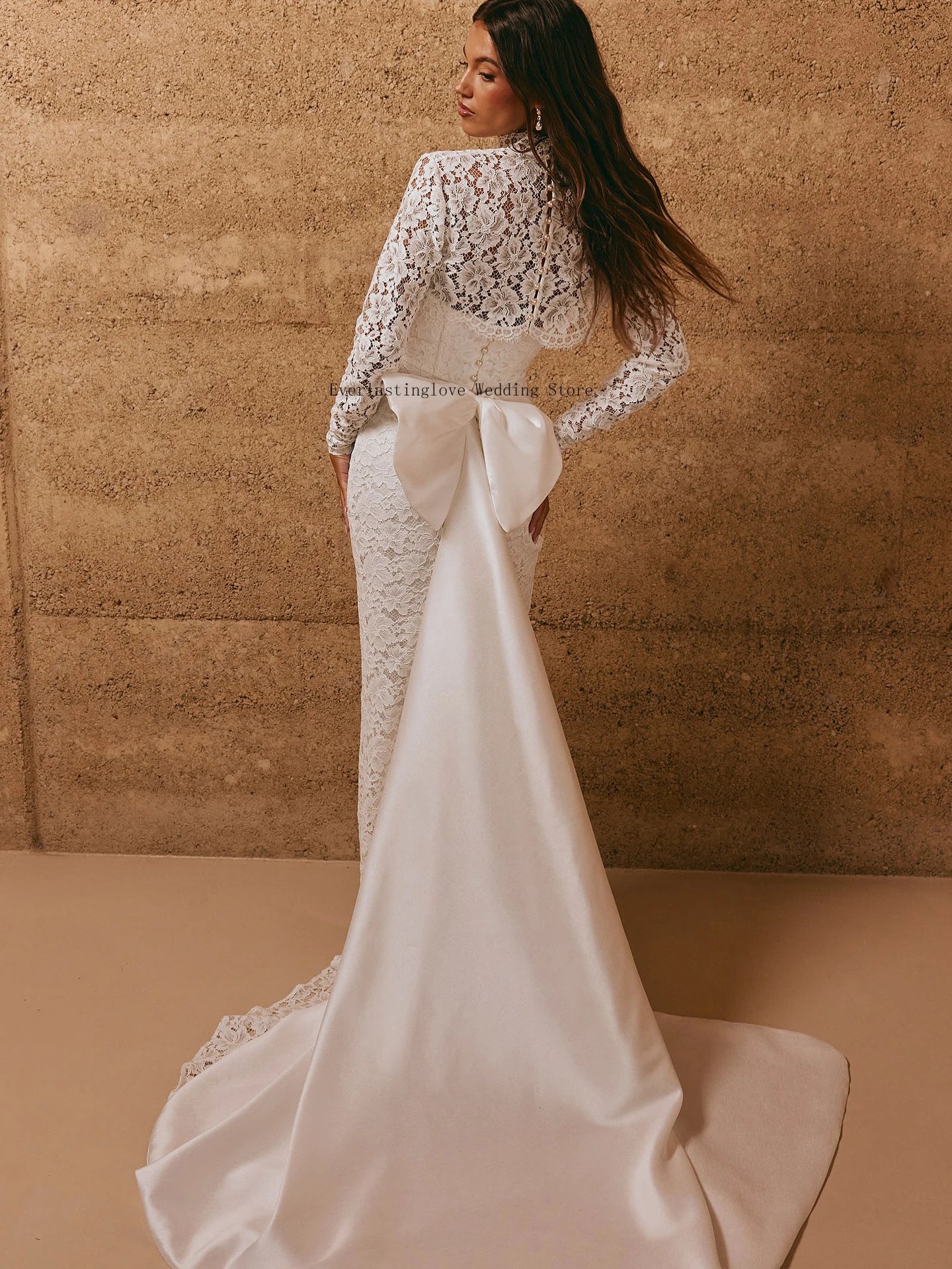 Elegant Fitted Lace Wedding Dress with Detachable Long Sleeve Jacket & Oversized Bow