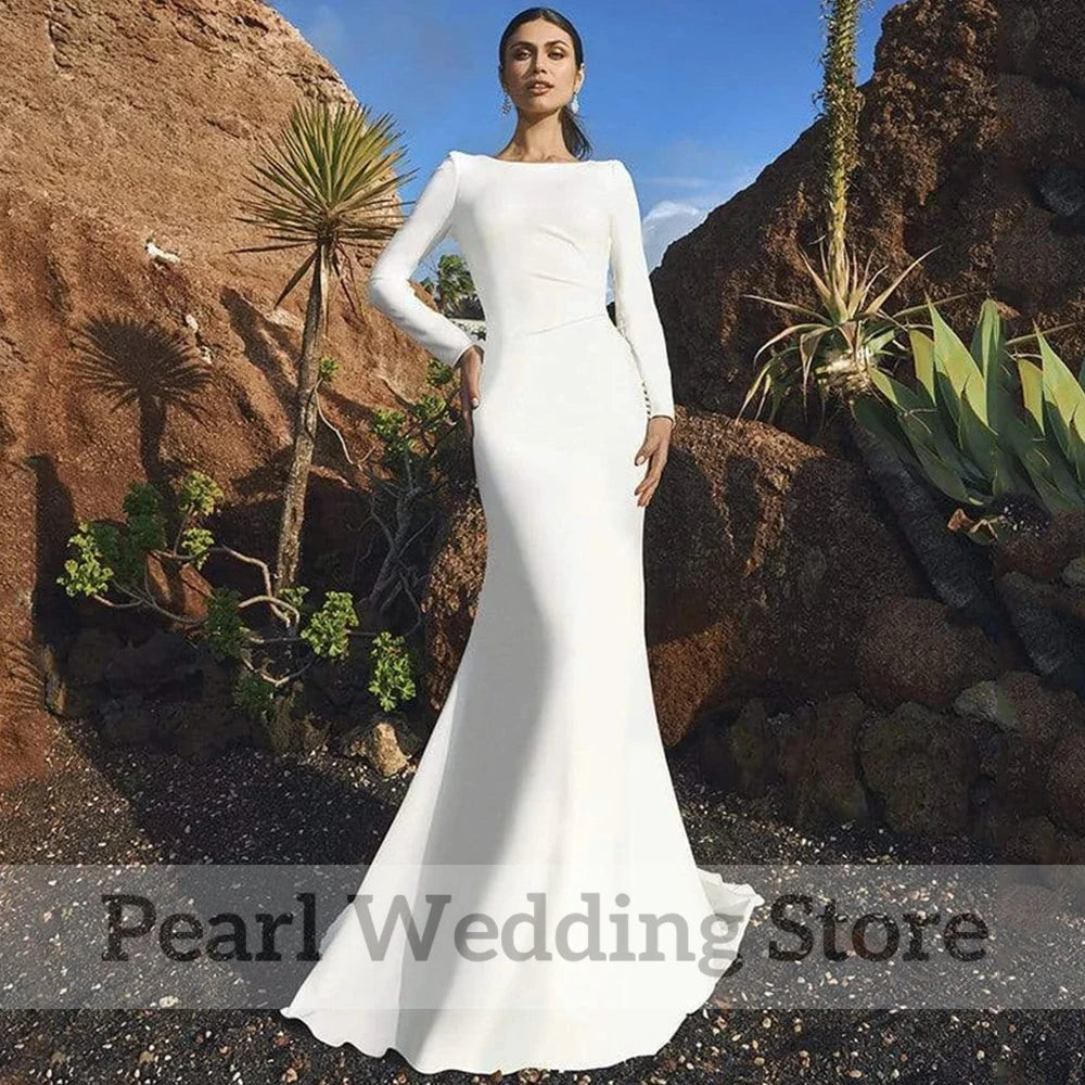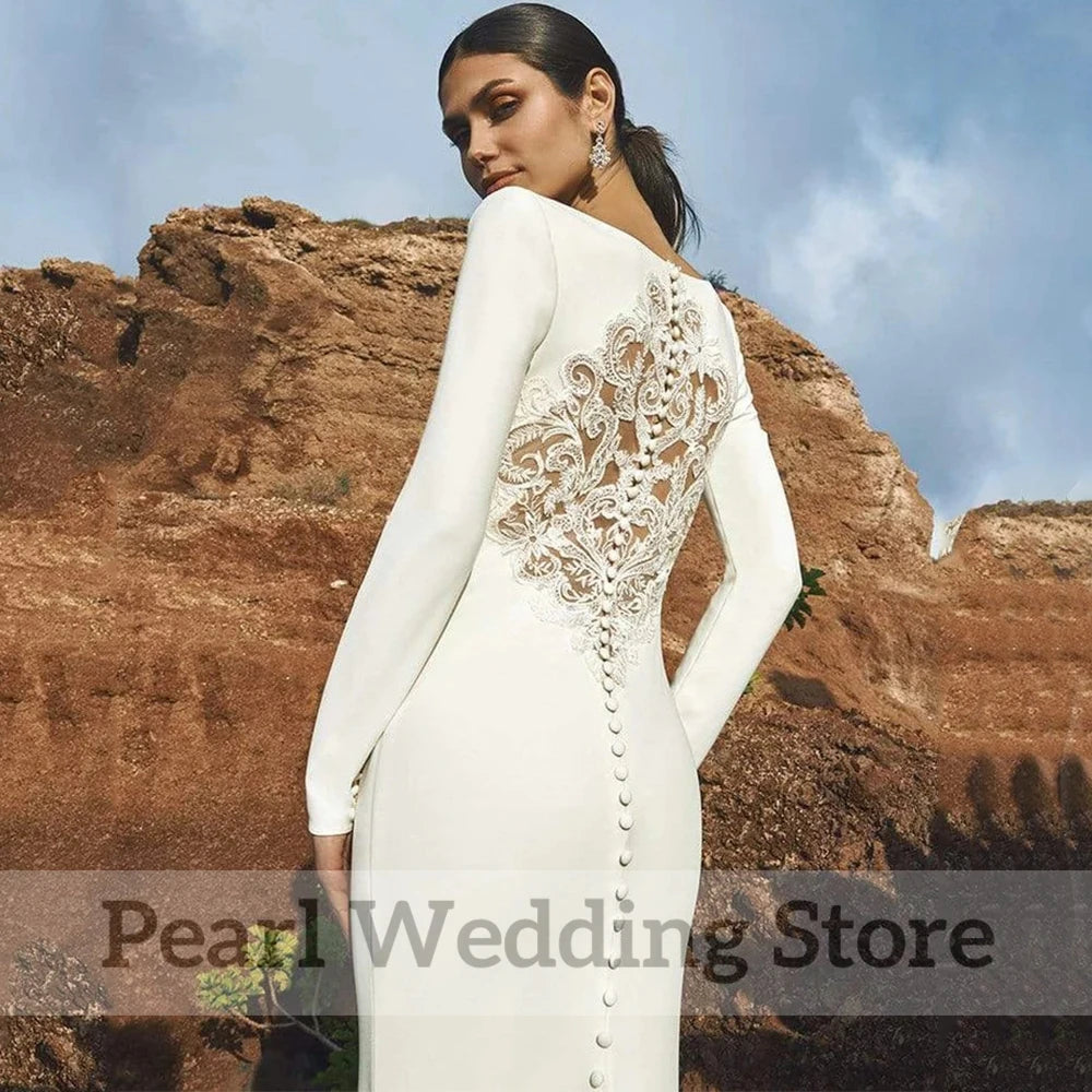 Elegant Mermaid Scoop Wedding Dresses Long Sleeve with Button Satin Bride Formal Dress Illusion Applique Back Sweep Train Custom
