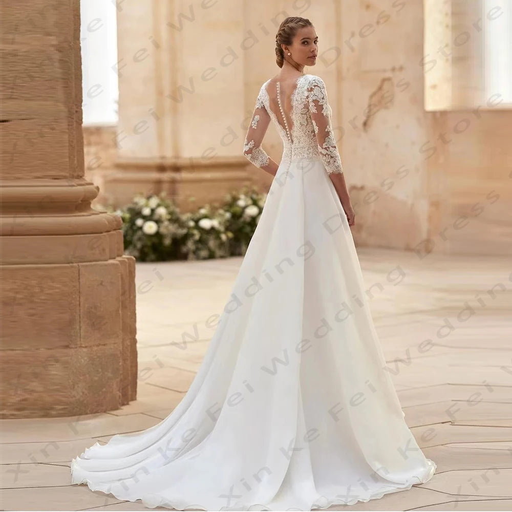 Elegant Women's V-Neck Wedding Dressees Lace Applique Long Sleeved Princess A-Line Bridal Gowns Formal Beach Party Welcome Guest