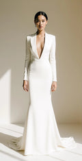 Elegant Long Sleeve Backless Wedding Dress – Minimalist Plunging V-Neck Gown with Train | Maison Bridal