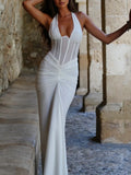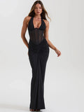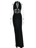 JULISSA MO Patchwork Sexy Deep V-neck Halter Women Maxi Dress Backless See Through Dress Summer Slim Elegant Party Evening Dress