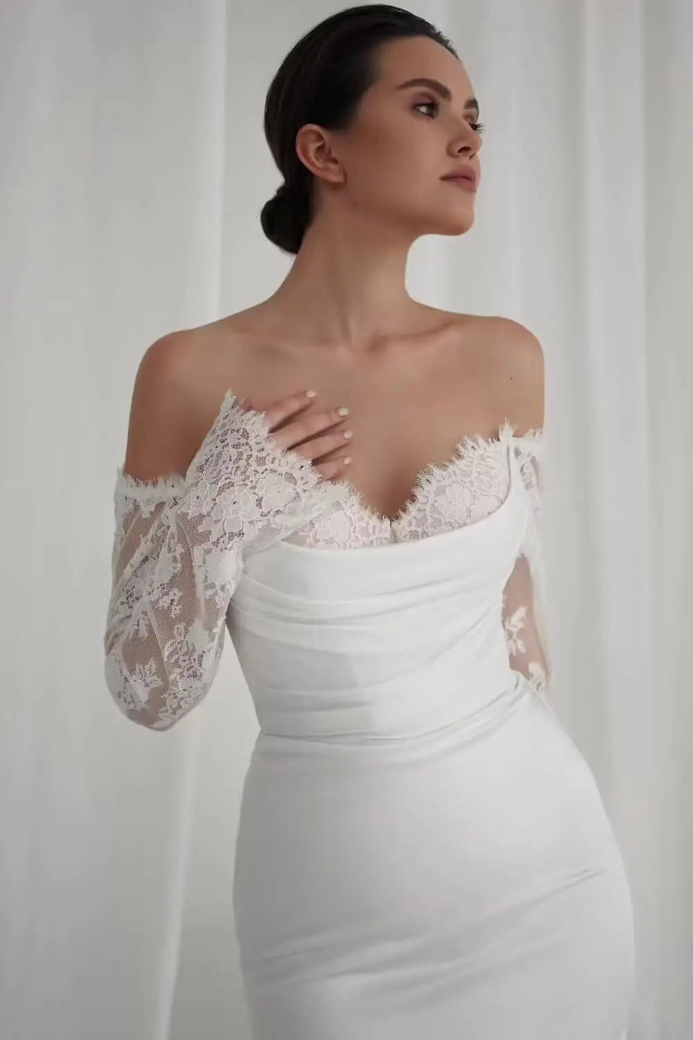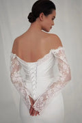 Designed for brides who desire both elegance and sensuality, this luxury fitted bridal gown features a sweetheart off-shoulder neckline framed by delicate lace long sleeves, blending classic femininity with a touch of contemporary refinement. The structured bodice and slim silhouette gracefully enhance every curve, offering a flattering fit that exudes confidence and grace.