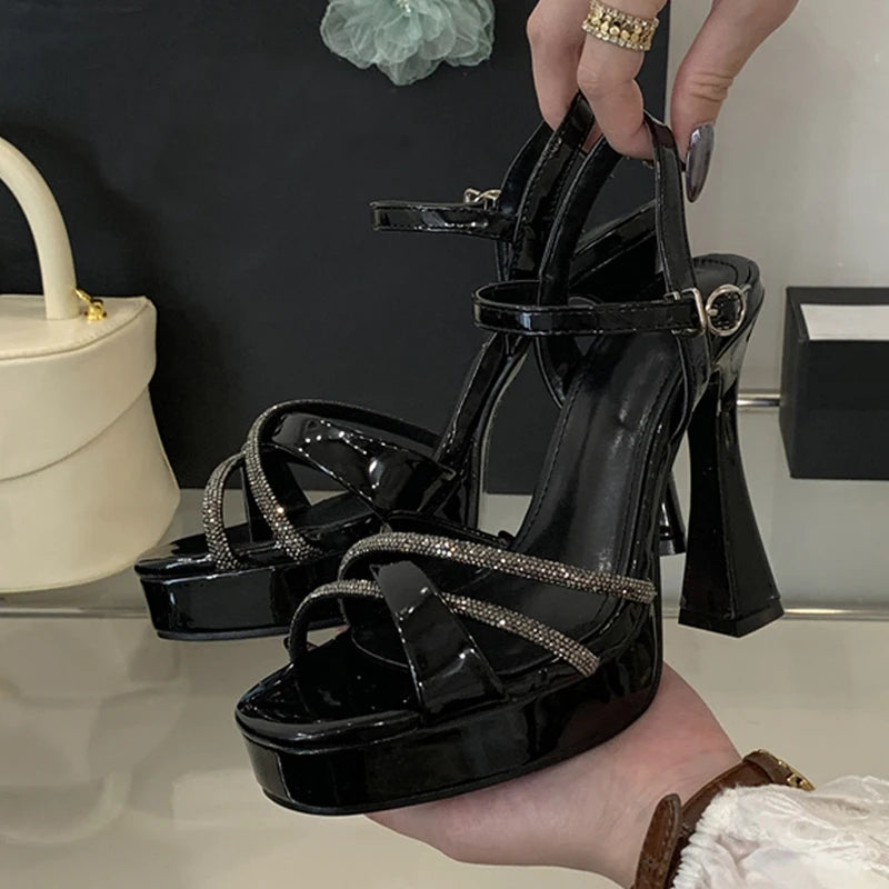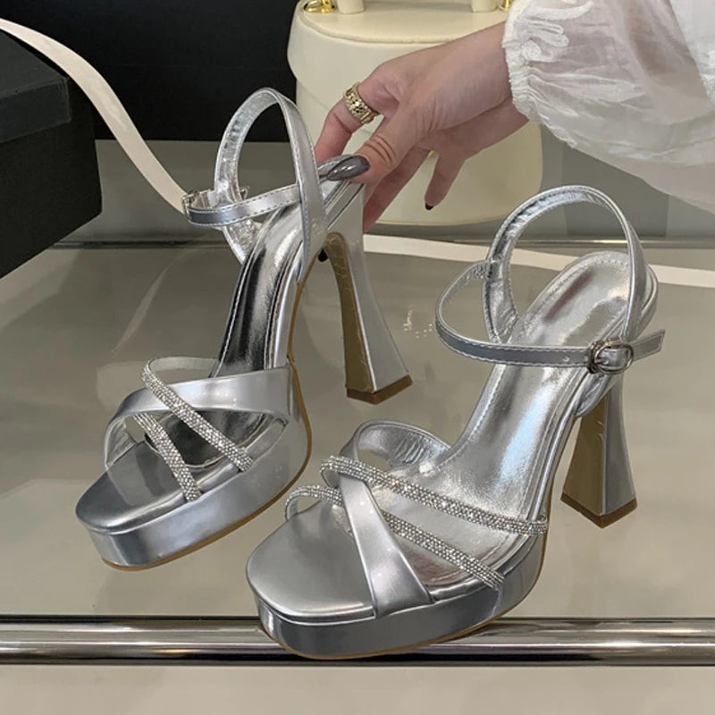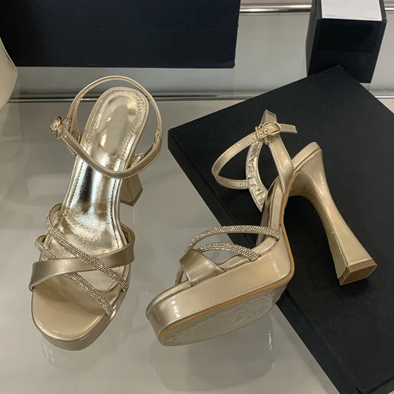 Liyke 2025 New Fashion Runway Super High Heels Platform Sandals Rhinestone Ankle Strap Open Toe Wedding Party Shoes Women Gold
