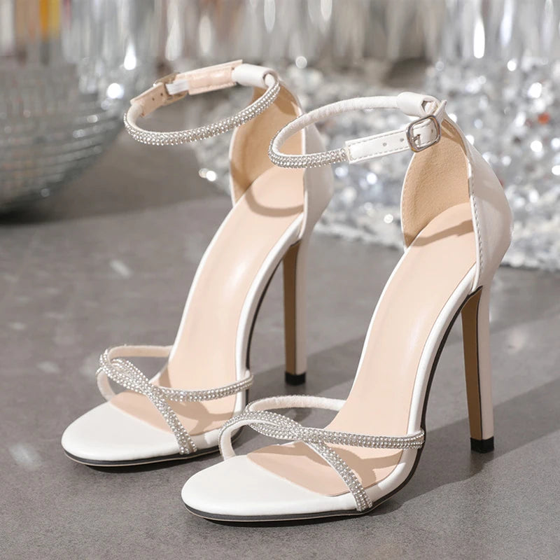 Liyke Crystal Rhinestone Narrow Band Women Sandals Street Sexy Open Toe Elegant Thin High Heels Ladies Party Wedding Shoes Bride
