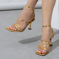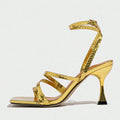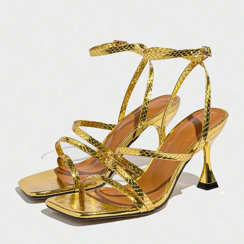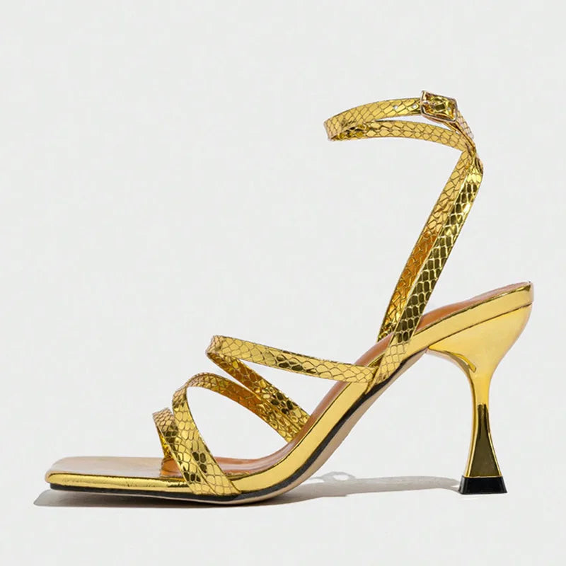 Liyke Sexy Snake Print Leather Ankle Strap Gold Sandals Women Narrow Band Square Open Toe Gladiator High Heels For Ladies Shoes