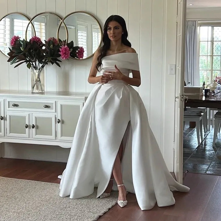Luruxious One Shoulder Sheath Satin Wedding Dresses With Detachable Train Custom Made Bridal Grown 2025 Rode De Morrie