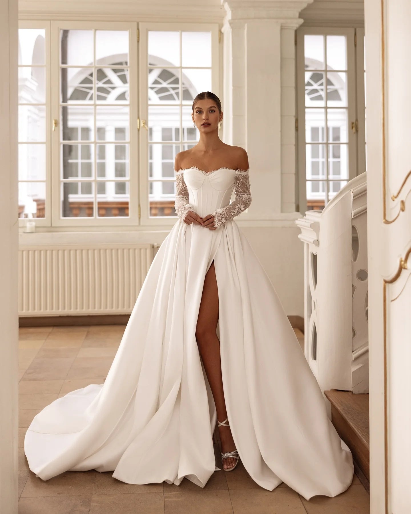 Luxurious Off The Shoulder Long Sleeves Sweetheart Satin A Line Wedding Dresses Side Slit CUstom made 2025 Vestido De Noival