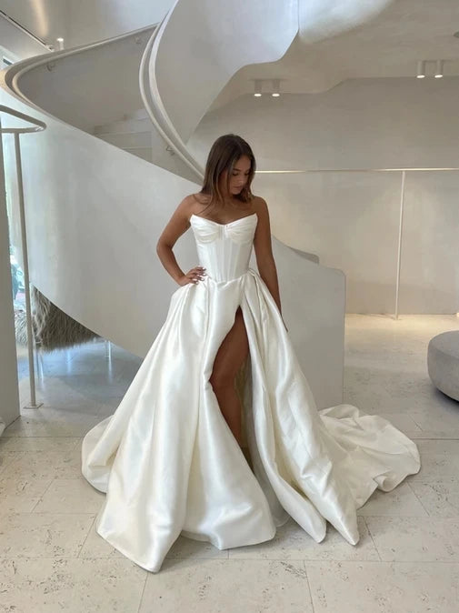 Luxurious Sweethart Satin A Line Wedding Dresses Side Slit Sweep Train Custom Made 2024 Vestido De Noival