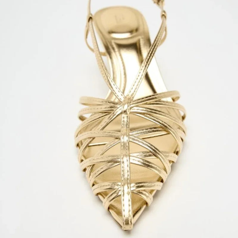 Luxury Gold Brand Heels Women Fashion Narrow Strap Hollow Thin High Heel Summer Sandals Sexy Pointed Toe Slingbacks Dress Shoes