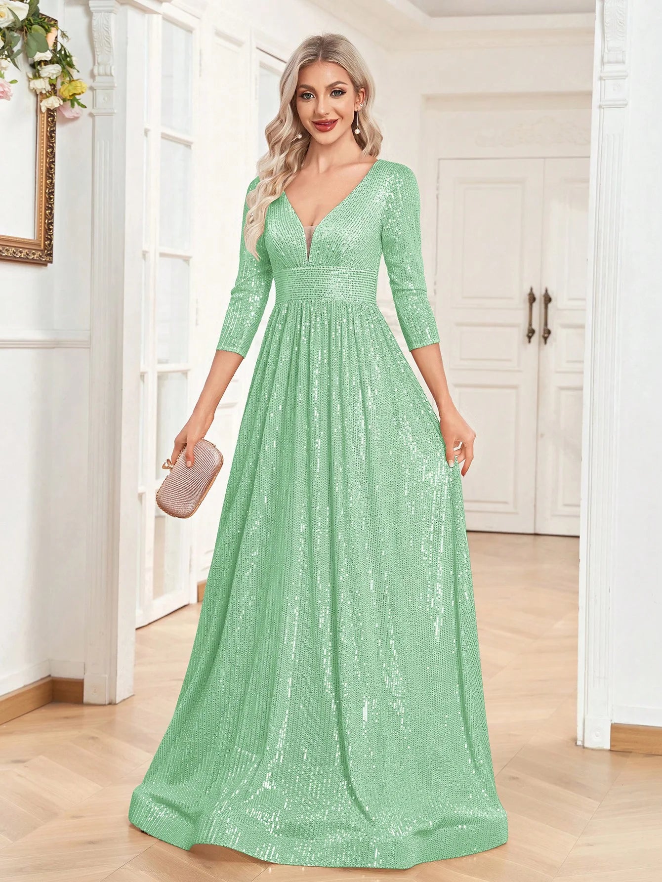 Luxury V Neck Long Sleeves Blue Sequins Formal Evening Dress Women 2025 Wedding Party Prom Maxi Cocktail Dress Gowns