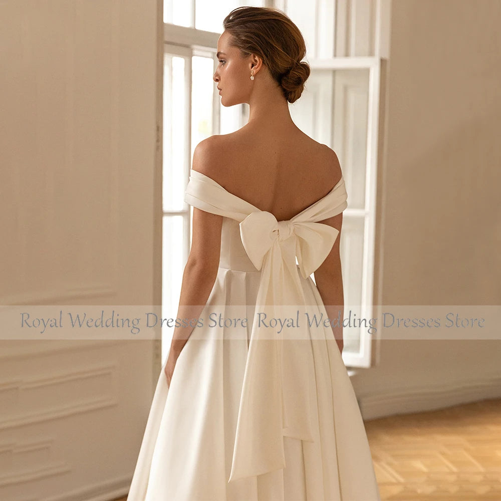 Midi Wedding Dresses Ivory Satin Off the Shoulder Princess Gowns for Bride A Line Ankle Length Bow Short Bridal