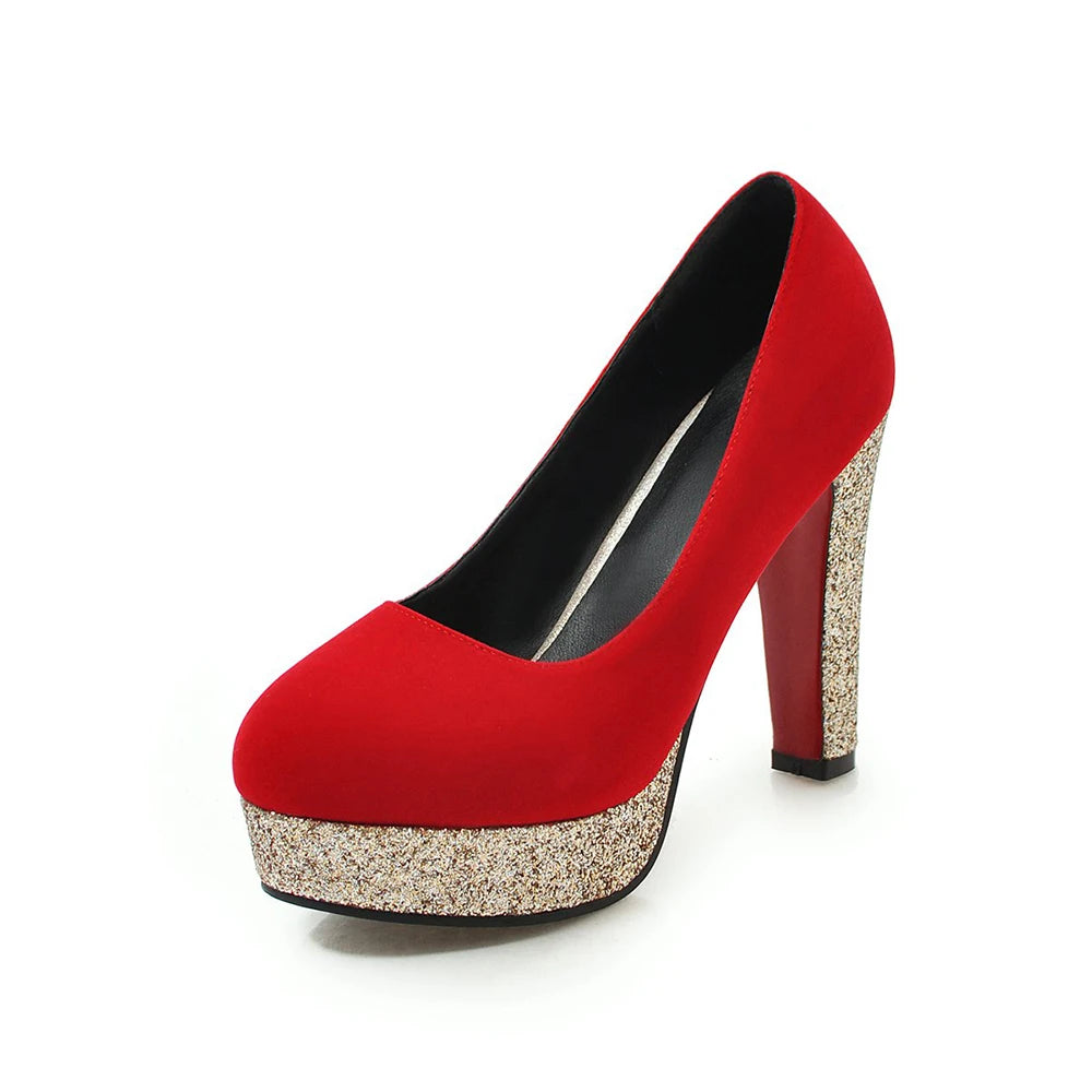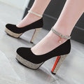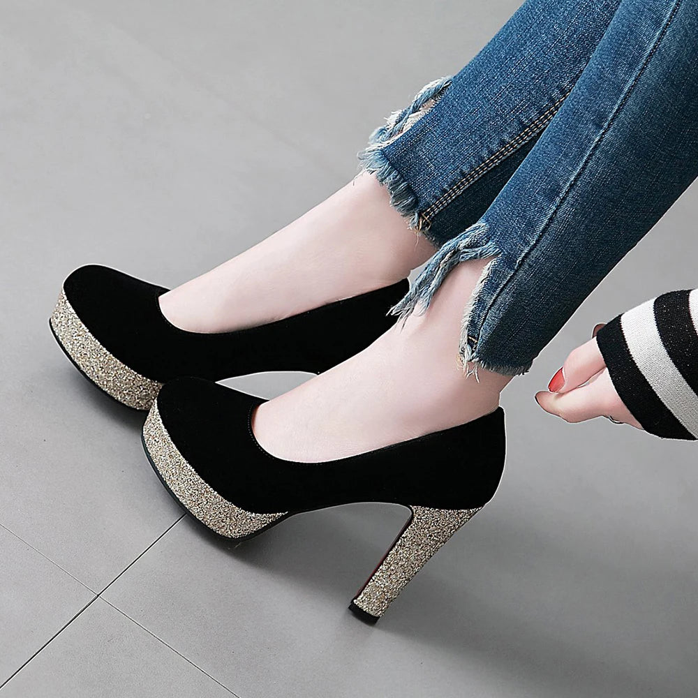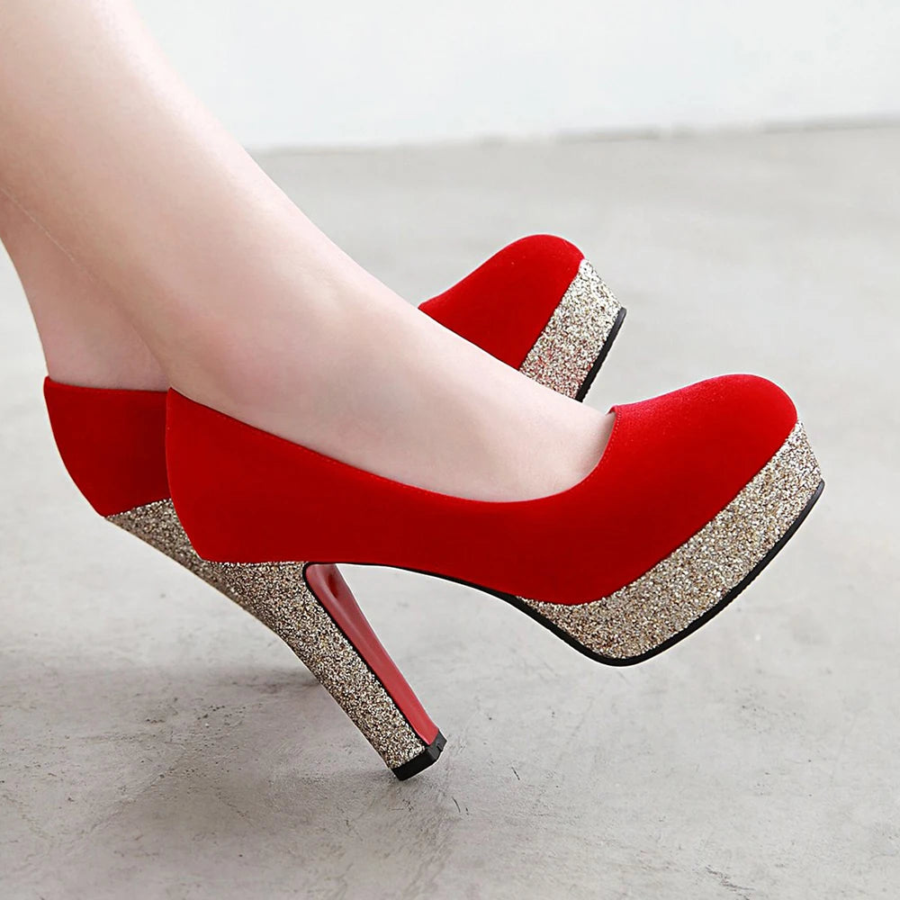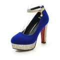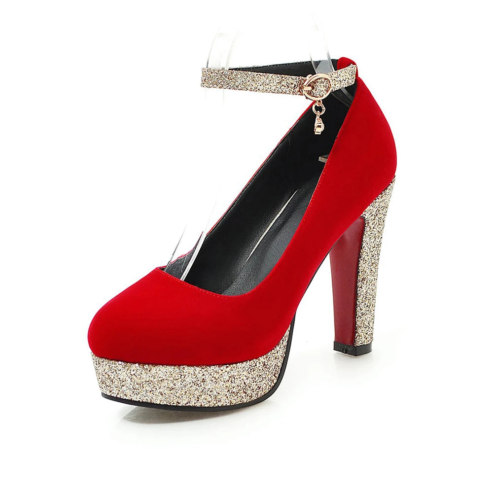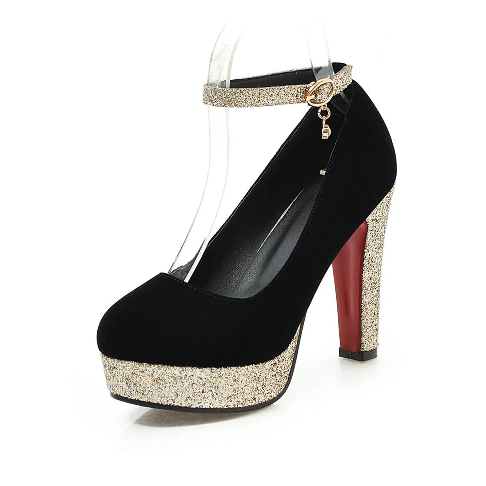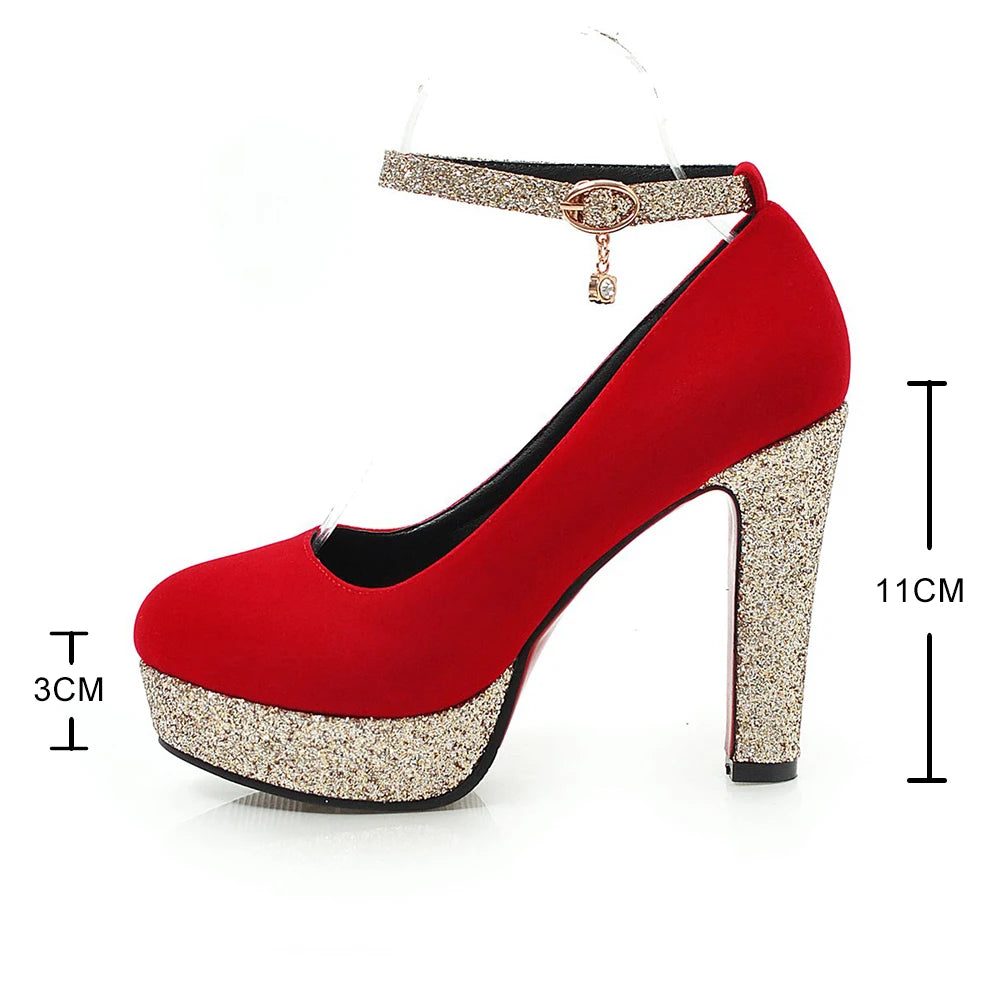 New Women Platform Pumps 12cm High Chunky Heels Sequined Round Toe Wedding Party Dress Shoe Gold Ankle Strap Ladies Danc Shoes