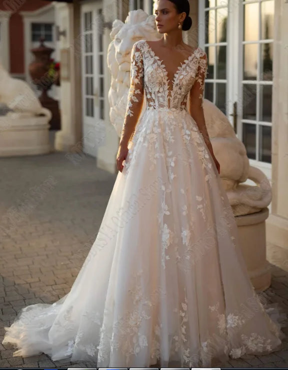 RODDRSYA Customized Luxury Long Sleeves Wedding Dress A Line Applique Lace Scoop Neck Soft Tulle Boho Bridal Gown Sweep Train