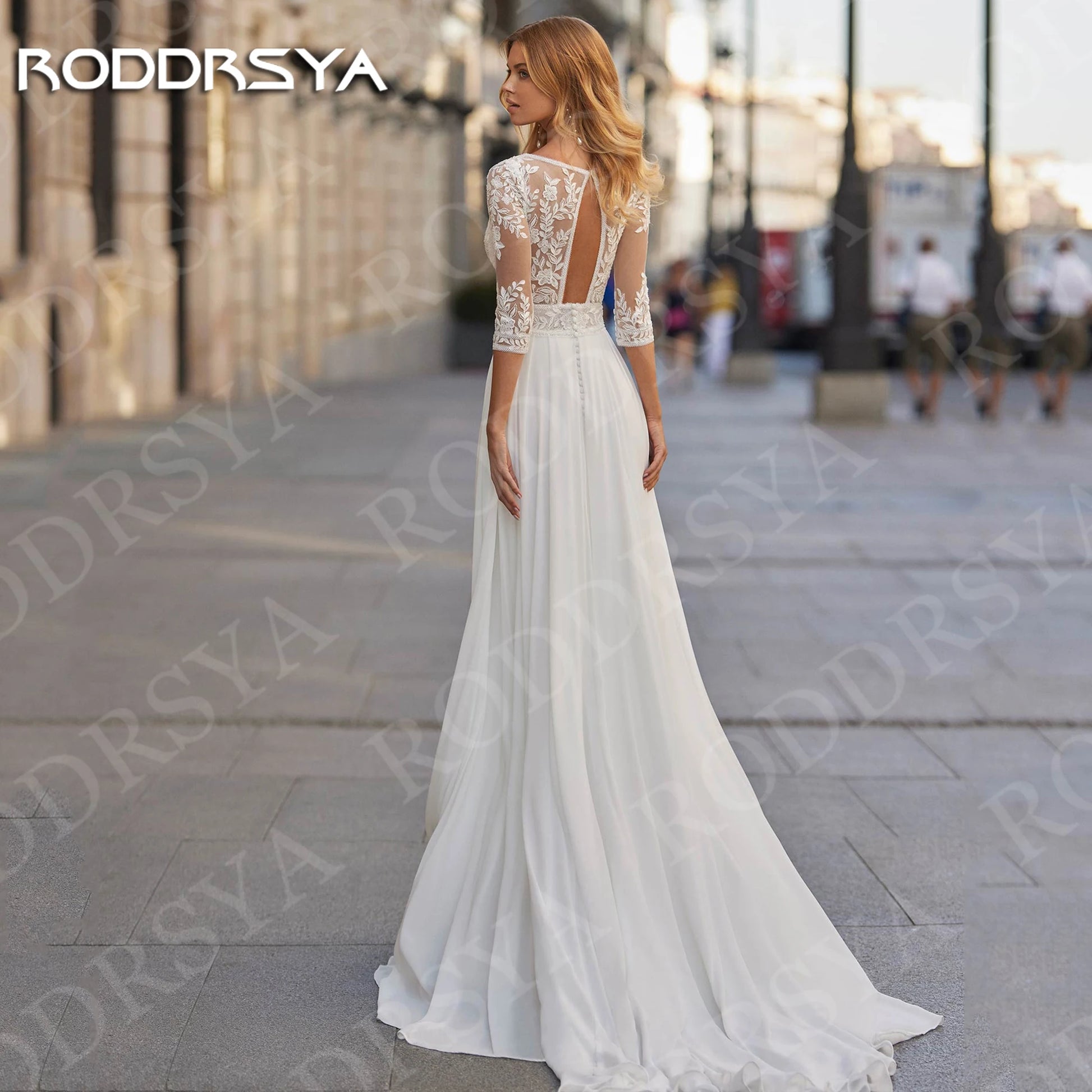 RODDRSYA Modern A Line Wedding Dress Chiffon Split Front Illusion Lace Three-Quarter Sleeves Bridal Dresses Open Back Customized