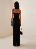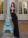 Sexy Spaghetti Strap Mesh Patchwork Hollow Out Bandage Dress Women Black Sleeveless V Neck Bodycon Dresses Evening Party Gowns