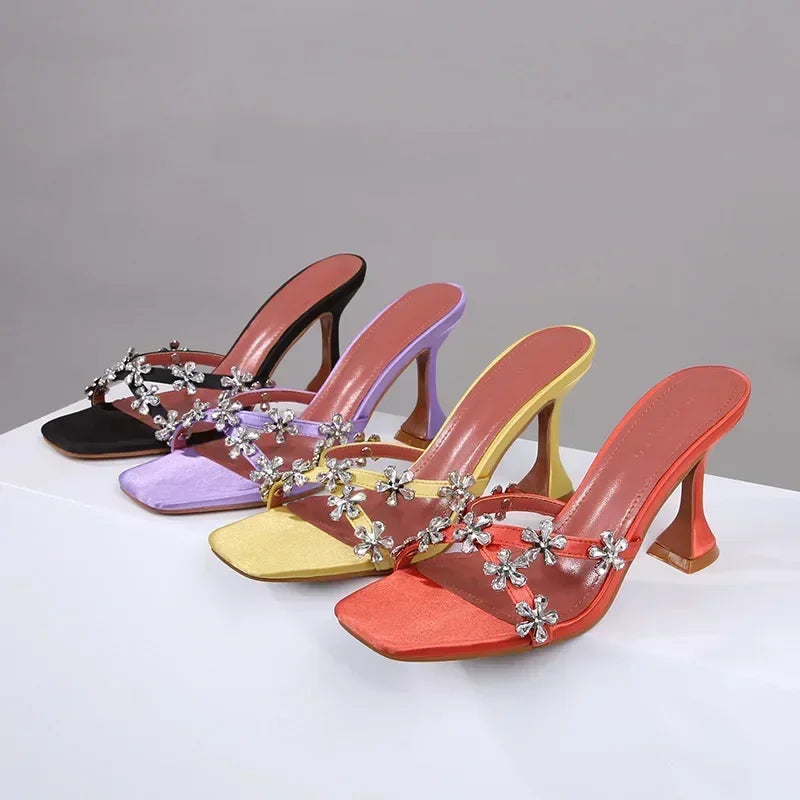 Shiny Crystal Flowers Decorative Women's Sandals 2025 Elegant High Heeled Slide Sandals for Women Cross Strap Summer High Heels
