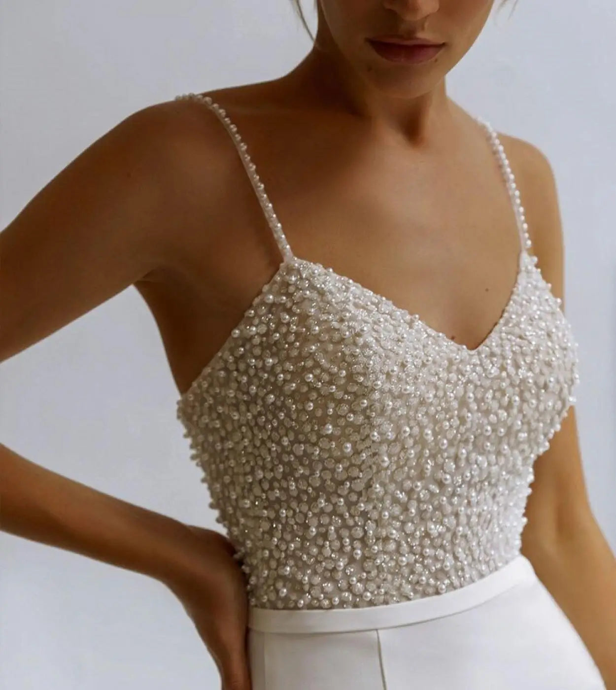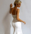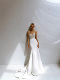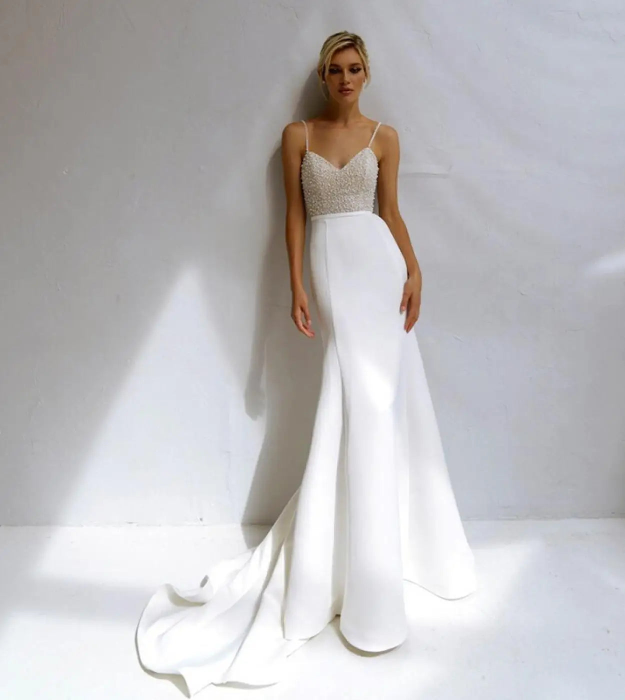 Shiny Spaghetii Straps Beaded Pearl V-neck Satin Sheath/mermaid Wedding Dresses Sweep Train 2026 Rode De Morrie