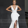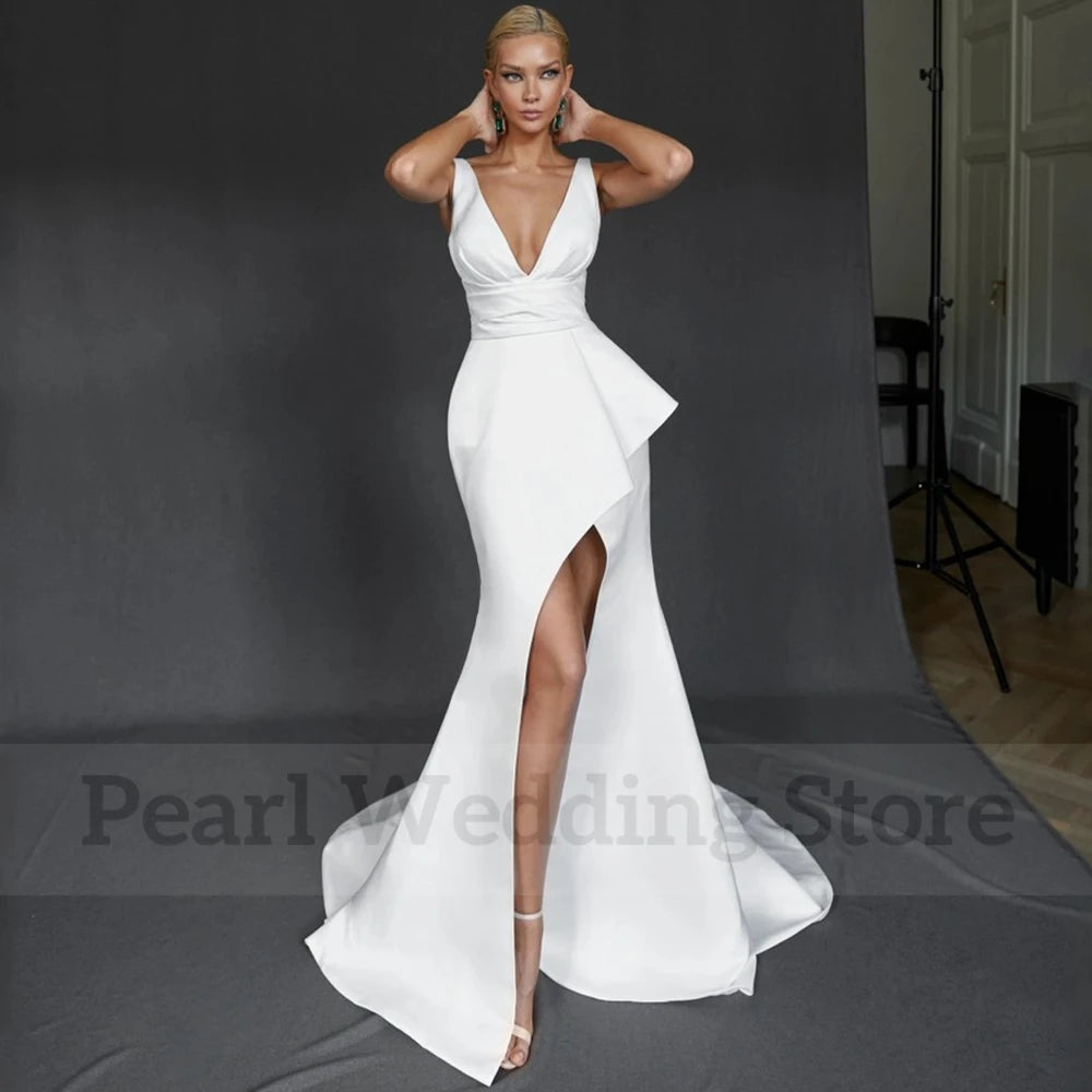 Simple V-Neck Sleeveless Wedding Dress Classic Satin Asymmetry Mermaid Slit Floor Length Sweep Train Bride Backless Custom Gown