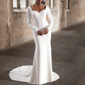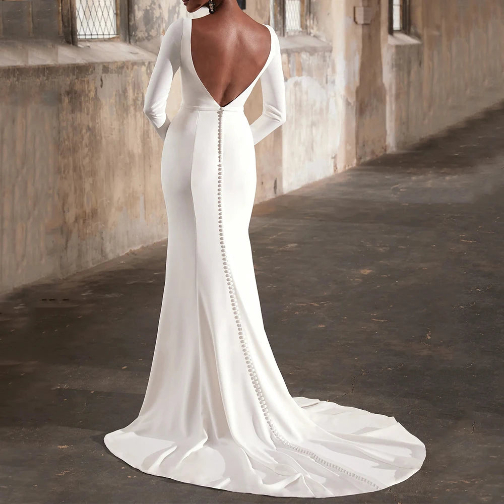 Simple Wedding Dress Crepe Floor-Length V-Neck Bridal Open Back with Belt and Buttons Mermaid Long Sleeve Customized Gowns
