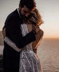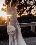 This A-line bridal gown features a deep V-neckline and illusion long sleeves, perfectly blending allure and sophistication. The bodice and skirt are adorned with hand-applied sequins and glitter details, catching every ray of light for a magical, ethereal effect.
