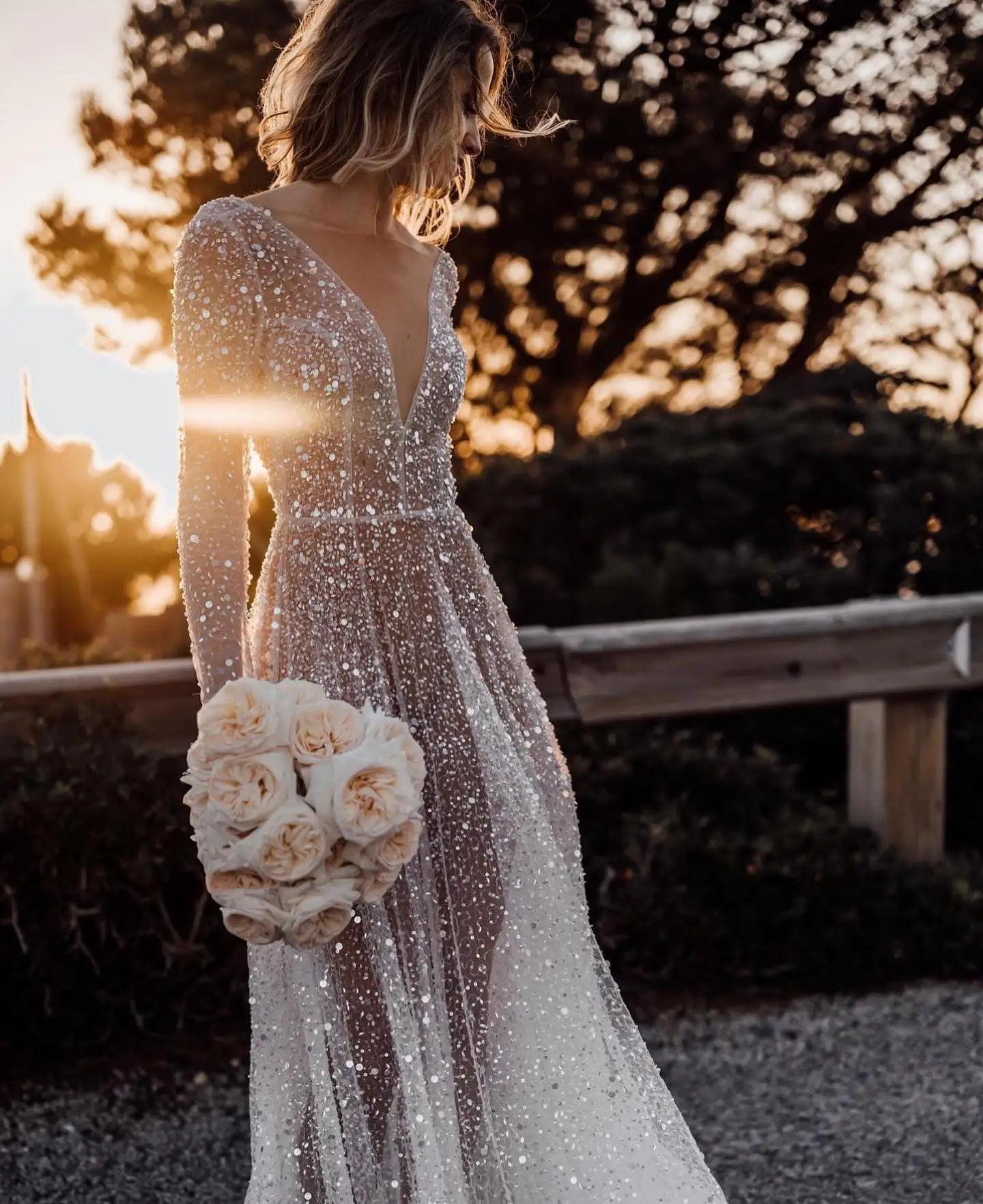Long Sleeve Sparkly Wedding Dress – Glitter Tulle A-Line Bridal Gown with Deep V Neck | Maison Bridal