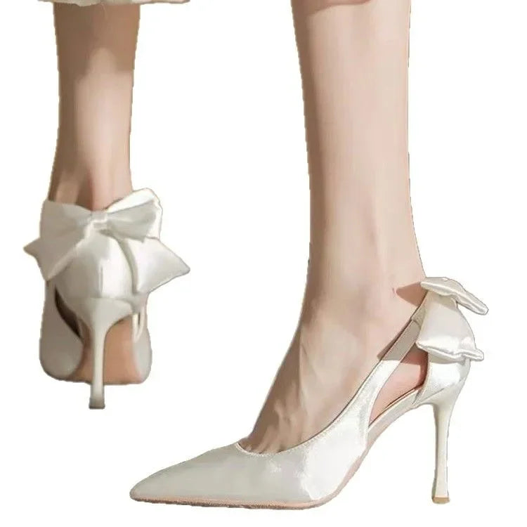 White High Heels Women's Thin Heel Pointed Toe Single Shoes New 2025 Wedding Shoes Butterfly Knot Satin Maids Dress Shoes