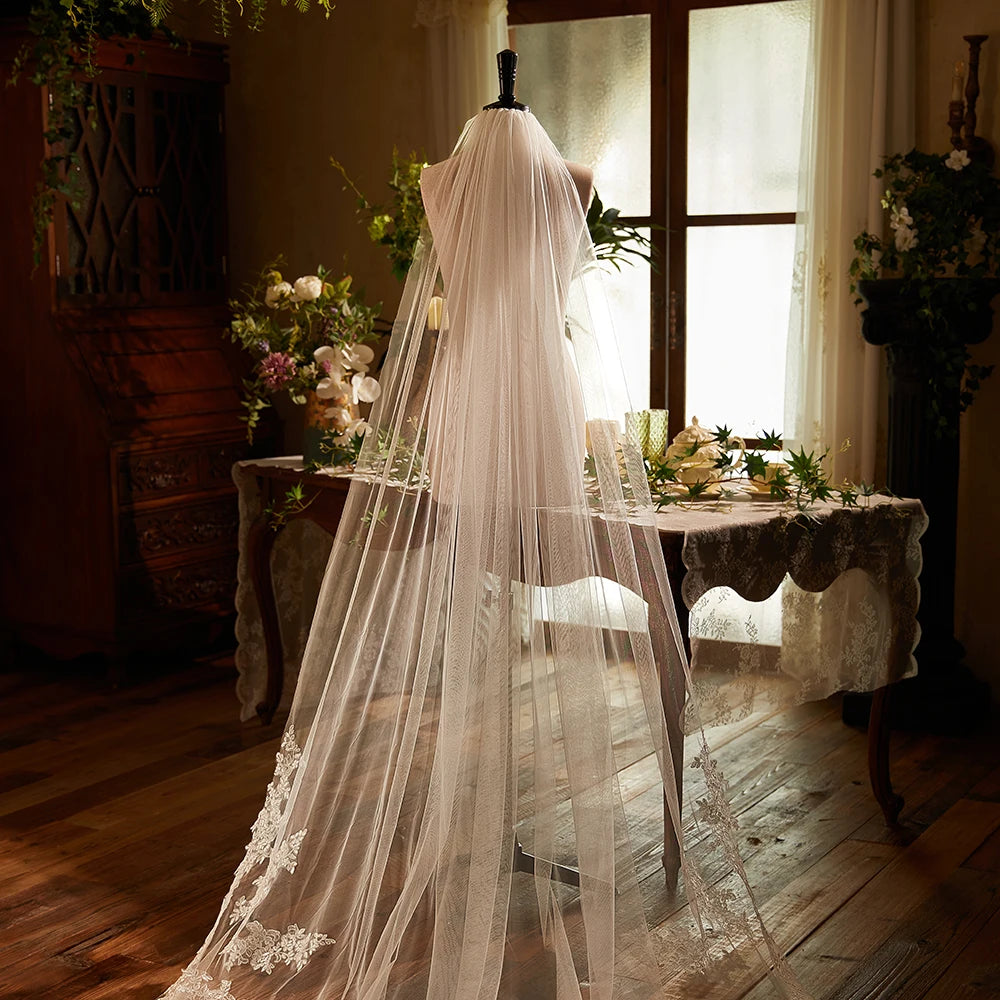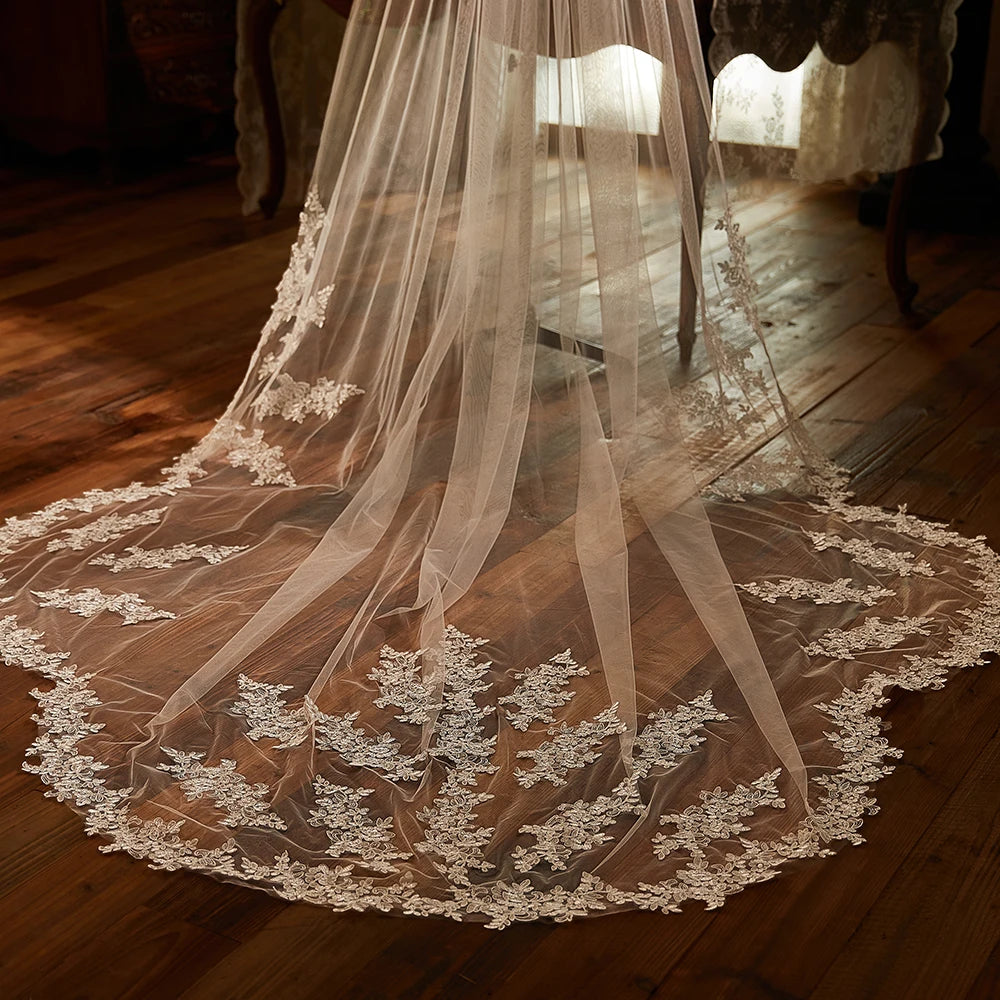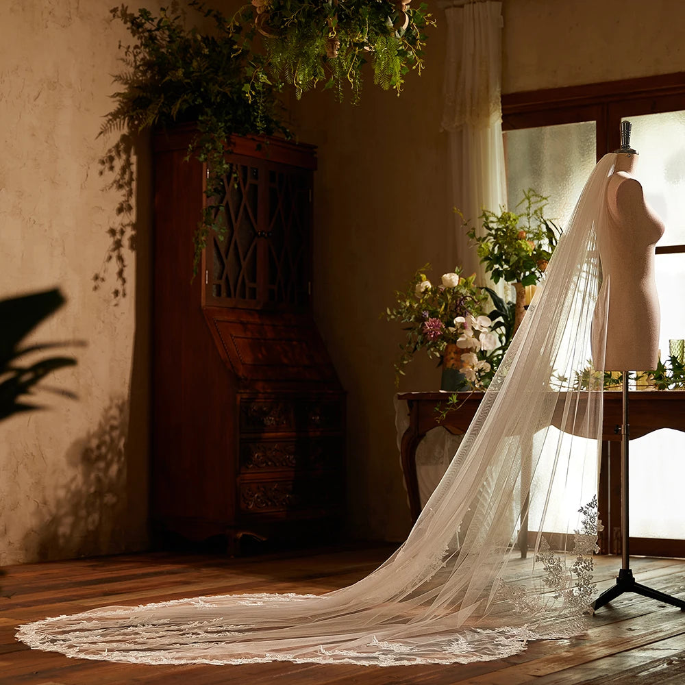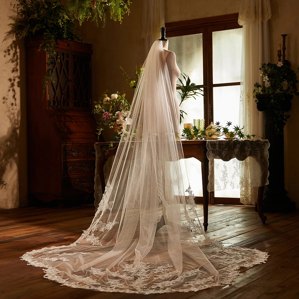 White Ivory One Layer Lace Wedding Veil with Lace Applique Cathedral Long Bridal Veils with Metal Comb Bride Accessories