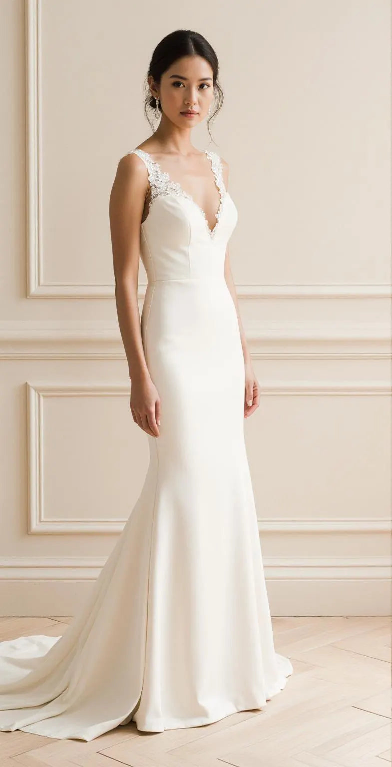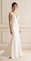 Handcrafted from premium ivory crepe, this design features a deep V-neckline, open back with lace detailing, and a soft sweep train for effortless sophistication. The slim silhouette highlights your natural shape while offering comfort and grace from ceremony to celebration.